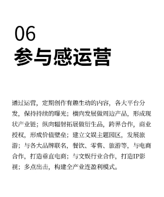 6. 参与感运营:定期创作有趣生动的内容,在各大平台分发,保持持续曝光;横向发展周边产品,形成产业链;纵向拓展衍生品、开展跨界合作与商业授权,形成价值壁垒;建设文娱主题园区,发展旅游;与各品牌联名,和电商合作打造垂直电商,与文娱行业合作打造IP影视,构建全产业链盈利模式。